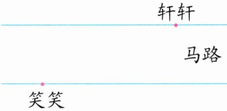 4. 如图,笑笑要走到马路对面,怎样走路线最短?轩轩要走到笑笑的位置,怎样走路线最短?画一画。