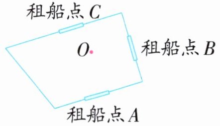 5. 如图,爸爸带乐乐到人工湖划船,当划到点 O 处时发现快到还船的时间了,他们想要尽快赶往最近的租船点,请你帮他们设计一条最短的路线。