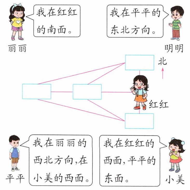 解析:图中红红的位置已明确,根据丽丽的话“我在红红的南面”可以先确定丽丽的位置,再根据平平和小美的话确定平平和小美的位置,最后确定明明的位置。