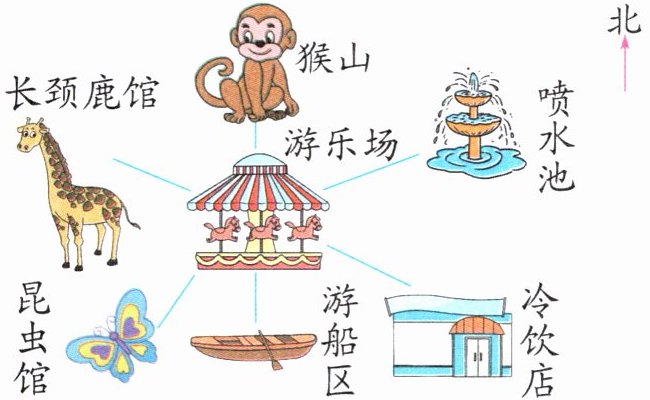 5. 如图,小虎从昆虫馆出发,往东北方向走到游乐场,并面朝北站立,猴山在他的“(