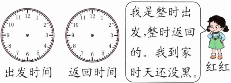 5. (生活应用)周六上午,红红在时针和分针成直角时出发去舅舅家玩,当天下午时针和分针成直角时返回。请在下面的钟面上画出红红出发和返回的时间。
