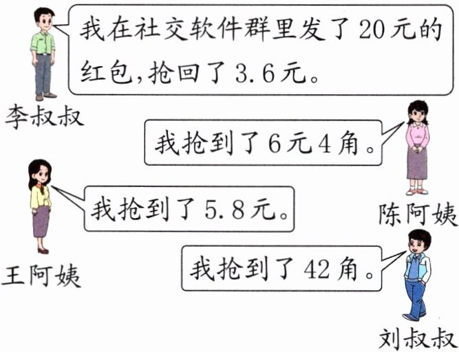 答案:5.3.6元=36角 6元4角=64角 5.8元=58角 36<42<58<64 陈阿姨的手气最好