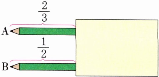 铅笔A可见部分占全长的$\frac{2}{3}$,铅笔B可见部分占全长的$\frac{1}{2}$,且两支铅笔可见部分长度相同。设可见部分长度为$x$,则铅笔A全长为$x÷\frac{2}{3}=\frac{3}{2}x$,铅笔B全长为$x÷\frac{1}{2}=2x$。因为$2x>\frac{3}{2}x$,所以铅笔B长一些。