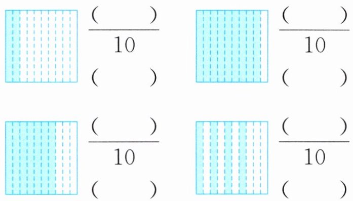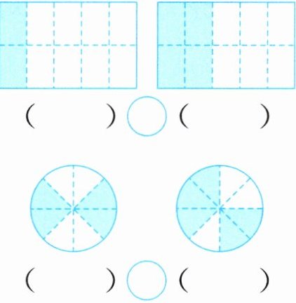 2. 先写出涂色部分表示的分数,说说各有几个分数单位,再比较大小。