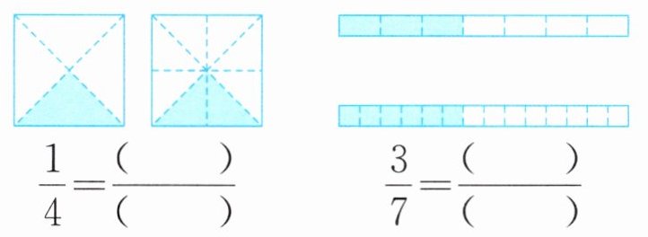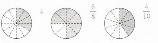 2. 先在图中涂色表示已知分数的等值分数,再填一填。
