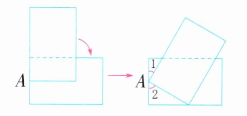 (9)(徐州鼓楼区)小红将两张长方形纸上下摆放(如图),下面的一张纸固定不动,上面的一张纸绕点 A 按顺时针方向旋转,她发现在旋转过程中,$∠1$和$∠2$的度数都在变化。想一想,完成下面的表格。