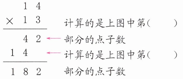 (1)用竖式计算$14×13$时,箭头所指的这两步分别计算的是上图中哪些部分的点子数?(在括号里填相应的序号)
