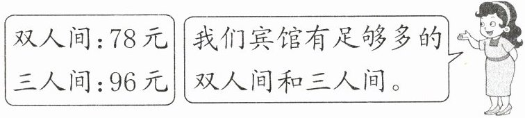 答案:[附加题]96÷3 = 32(元) 78÷2 = 39(元) 32 < 39 优先住三人间,且尽量住满