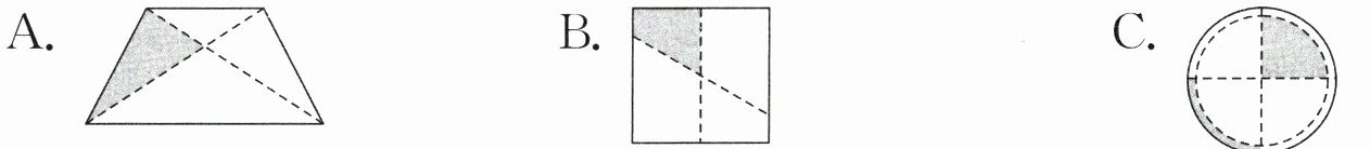 9. 如右图,A 占这个圆的$\frac{(\ )}{(\ )}$,B 占这个圆的$\frac{(\ )}{(\ )}$,C 占这个圆的$\frac{(\ )}{(\ )}$。