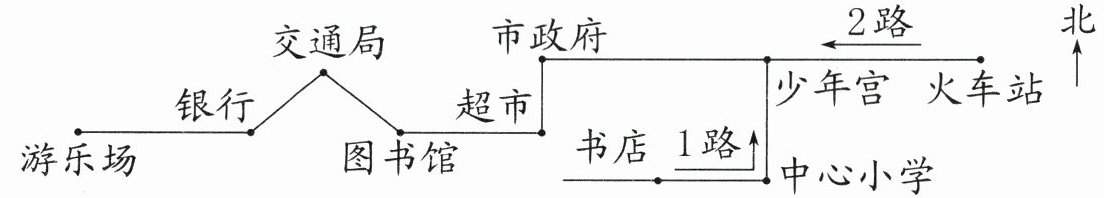 6. 新情境 生活应用 1路车途经书店开往火车站,2路车从火车站开往游乐场。