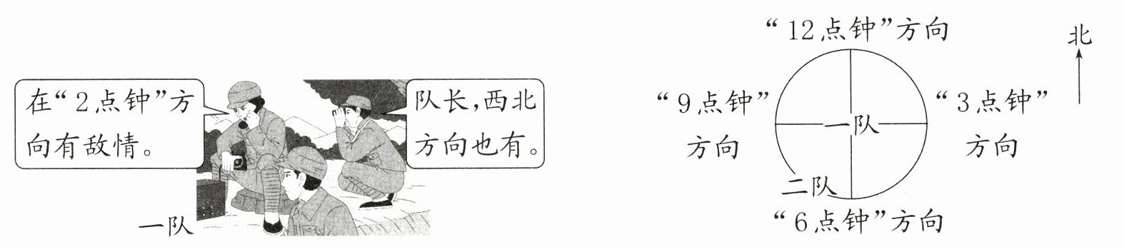 2. 新趋势 创新应用 军队在野战训练中会用“几点钟”来描述方向。一队面向北,他们的正前方就是“12点钟”方向,根据对话完成问题。