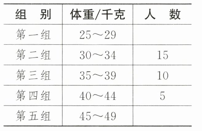(3) 不可能 理由:通过统计表和条形统计图可知,体重在35千克及以上的学生共有10+5+4=19(人),体重在40千克及以上的学生共有5+4=9(人),所以小丽的体重在35~39千克的范围内。