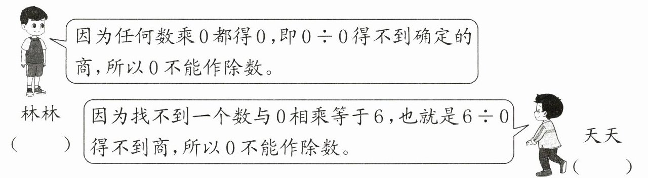 在除法中,0 除以任何不为 0 的数都得 0,0 不能作除数。下面有两个关于“0 为什么不能作除数”的说法,对的画“√”,错的画“×”。