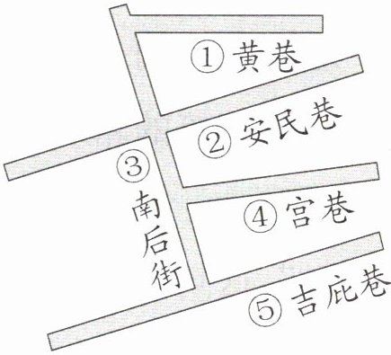 2. 新情境 地域景观 三坊七巷位于福州鼓楼区,因至今仍保留“西三个坊、东七条巷、南北一中轴”的古代城市里坊格局而得名。如图所示为三坊七巷的部分示意图,观察坊巷走向发现(