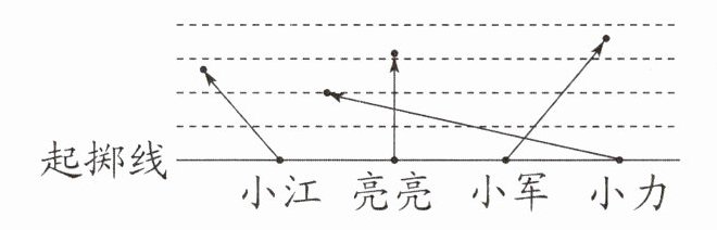 3. 新情境 五育并举 四个小朋友玩沙包,他们站在起掷线上原地投掷,沙包落地点到起掷线的距离是他们的投掷成绩。左下图是四人投掷沙包的示意图,(