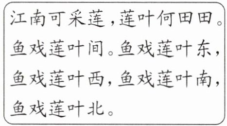 解析:这首诗歌一共有35个字,其中“莲”字一共有7个,“鱼”字一共有5个,所以“莲”字占诗歌总字数的$\frac{7}{35},$“鱼”字占诗歌总字数的$\frac{5}{35}。$
