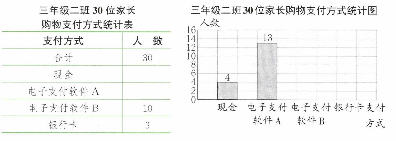 2. 新素养 数据意识 购物支付方式越来越灵活多样,三年级二班同学调查了30位家长的购物支付方式,制作了购物支付方式统计表和统计图。