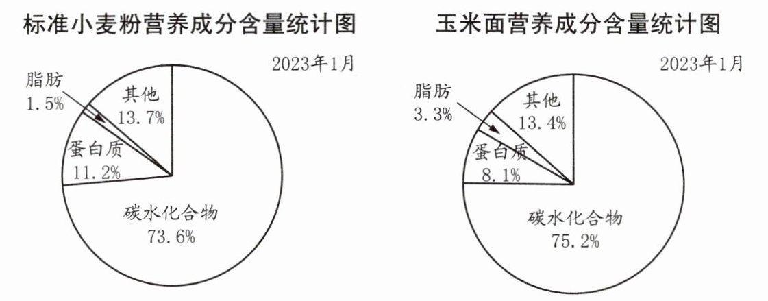 2. 蛋白质含量:标准小麦粉为11.2%,玉米面为8.1%,因为11.2%>8.1%,所以标准小麦粉的蛋白质含量高;