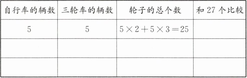 |自行车的辆数|三轮车的辆数|轮子的总个数|和27个比较|