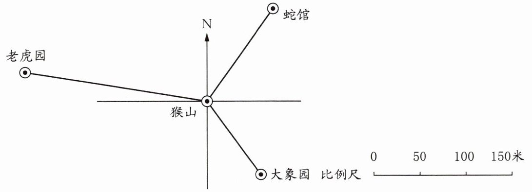 以猴山为观测点,观察平面图确定各地点的相对方向与角度,量取图上距离后,结合“图上1厘米代表实际50米”的比例尺计算实际距离: