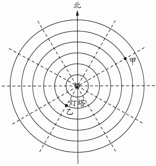 3. 下图是在一个雷达屏幕上显示的某海域的两个小岛,每相邻两个圆之间的距离为5千米。以灯塔为观测点,填写出它们的位置。