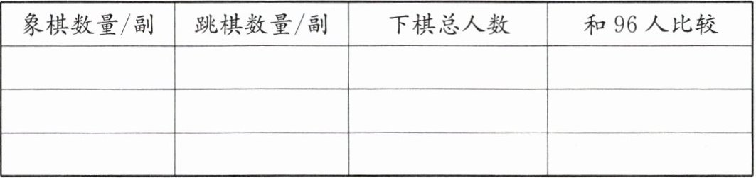 3. 学校有象棋、跳棋共 26 副,2 人下一副象棋,6 人下一副跳棋,恰好可以供 96 人进行活动。象棋、跳棋各有多少副?(先假设两种棋的数量,再调整找出答案)