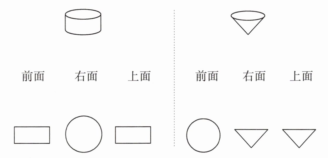 6. 从前面、右面和上面观察圆柱,看到的各是什么形状?从这三个角度观察圆锥呢?连一连。