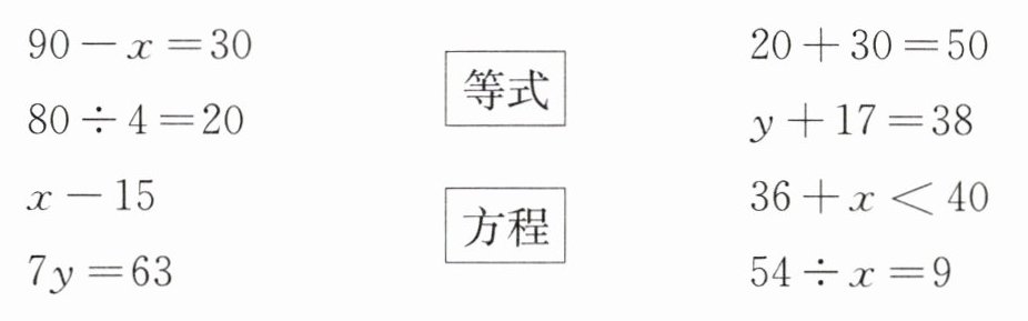 1. 等式是含有等号的式子,据此找出所有等式:$90-x=30$、$20+30=50$、$80÷4=20$、$y+17=38$、$7y=63$、$54÷x=9$;