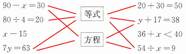 等式连:$90-x=30$、$20+30=50$、$80÷4=20$、$y+17=38$、$7y=63$、$54÷x=9$