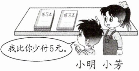 设每本练习本$x$元,小芳买5本花费$5x$元,小明买3本花费$3x$元,根据小芳比小明多付5元的等量关系列方程求解: