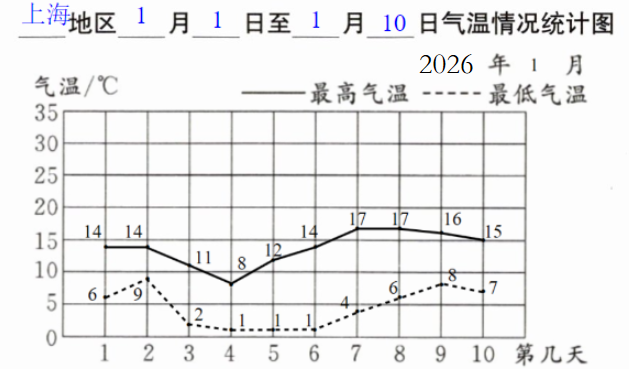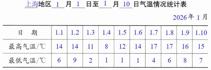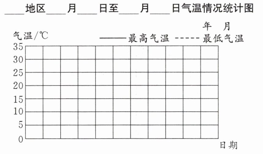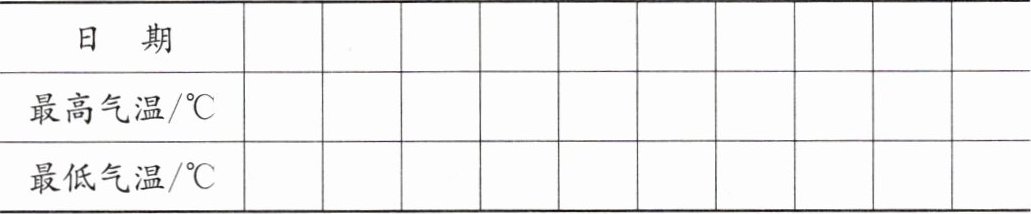 1. 先通过实际调查获取本地近10天的最高气温和最低气温,完成统计表与折线统计图;