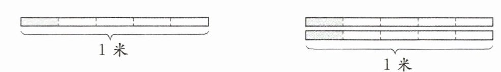 1. 把1米长的彩带平均分成5份,根据分数的意义,每份是1米的$\frac{1}{5}$;每份长度为$1÷5=\frac{1}{5}$米。