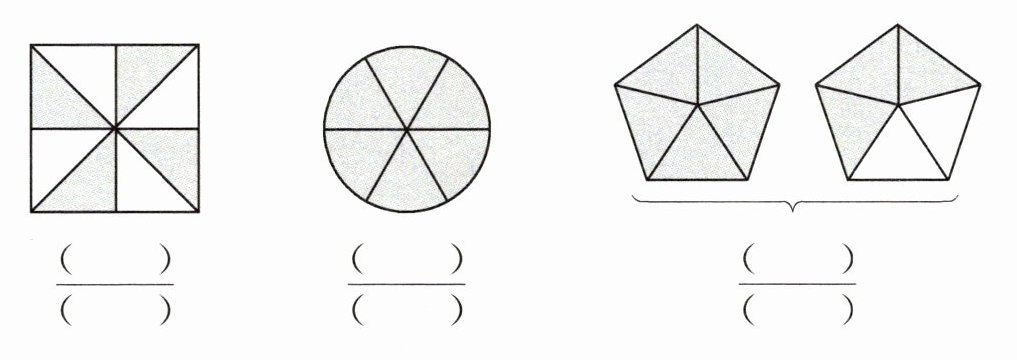 本题借助不同平面图形,考查对分数意义的掌握,需明确平均分的总份数和涂色部分的份数,区分真分数与假分数的应用。