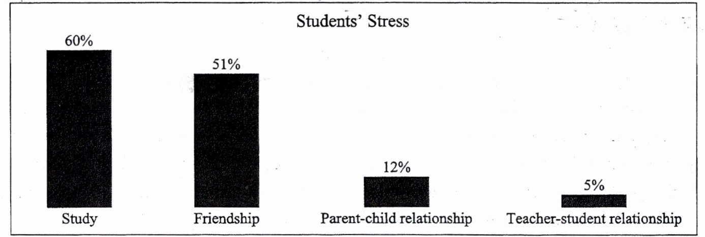 5% of the students have trouble dealing with the relationship between teachers and students. 12% of the students find it difficult to get along with their parents. 51% of the students have friendship problems. And without doubt, most of the students are stressed because of study, with the percentage going up to 60%.