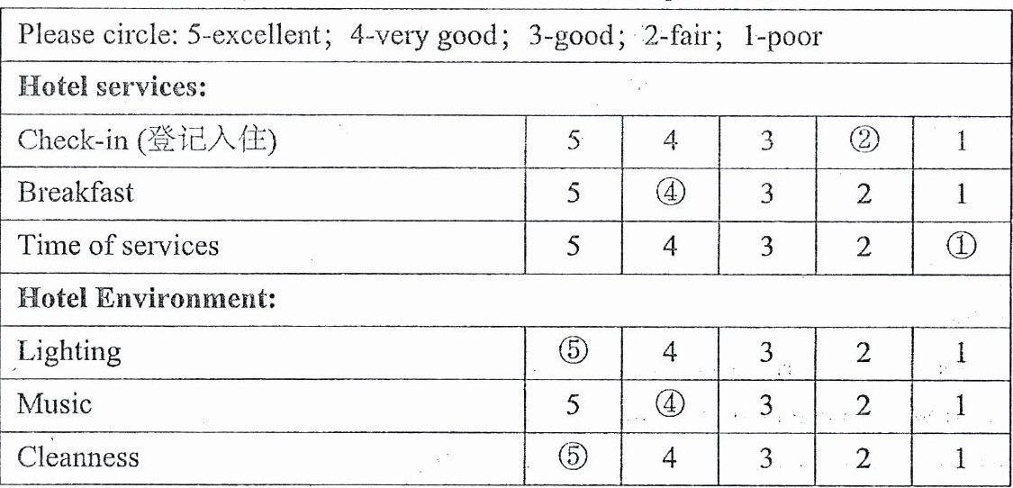 For the spring field trip,Maria had a visit to Mount Tai. She stayed in Sunshine Hotel. She was asked to complete a questionnaire(调查表). Finally,she got an umbrella as a gift at the Front Desk of the hotel.