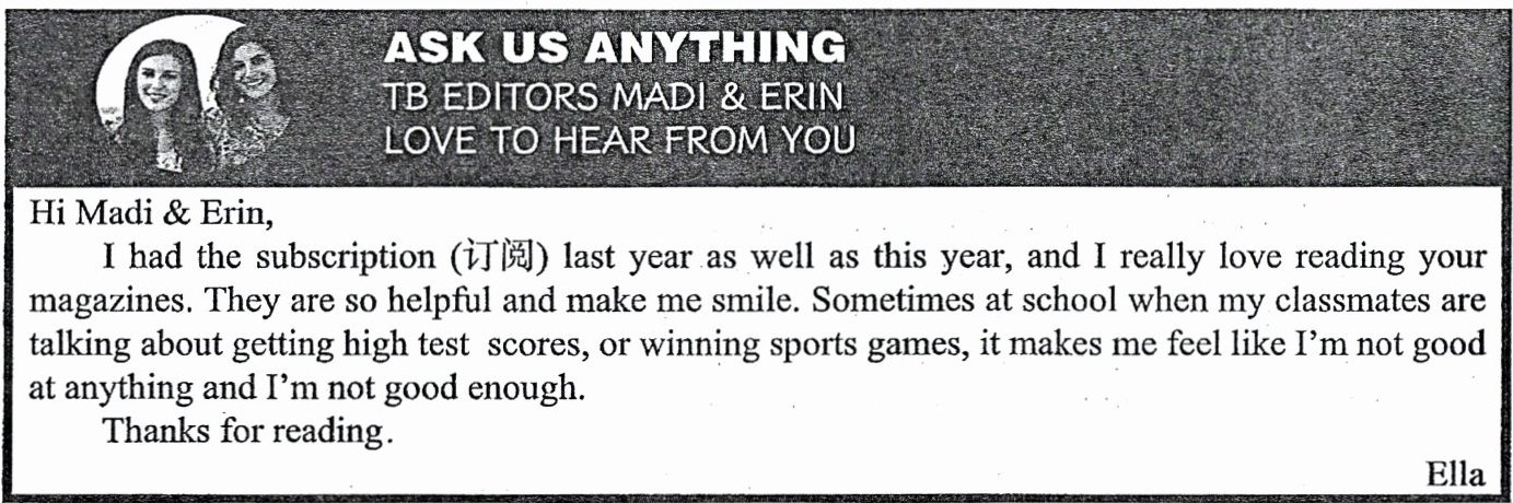)1. How does Ella probably feel about her situation?A. Angry.