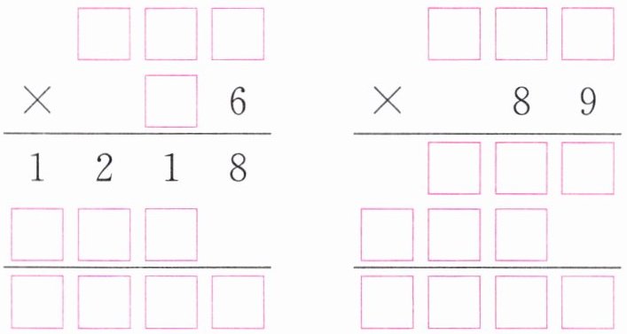 解析:第一个竖式,根据三位数乘6等于1218,可以推算出这个三位数是203,接下来还要满足203 乘第二个乘数十位上的数字还是三位数,第二个乘数的十位上可以是1、2、3、4,所以第一个竖式有4个不同的答案。第二个竖式要满足三位数乘8 或9还是三位数,从100到111都行,所以有多个答案。