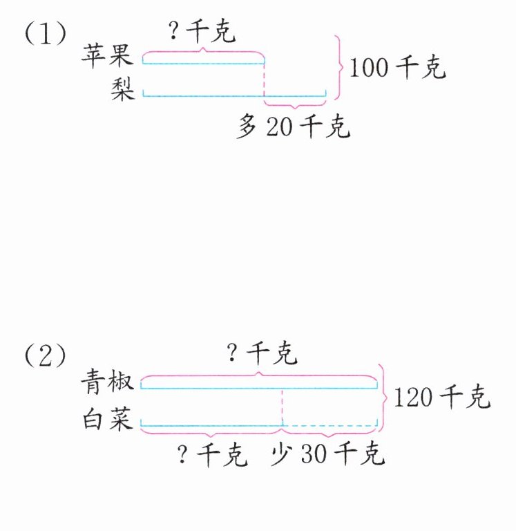 答案:说出已知条件和问题略 (1)(100−20)÷2=40(千克) (2)青椒:(120+30)÷2=75(千克)