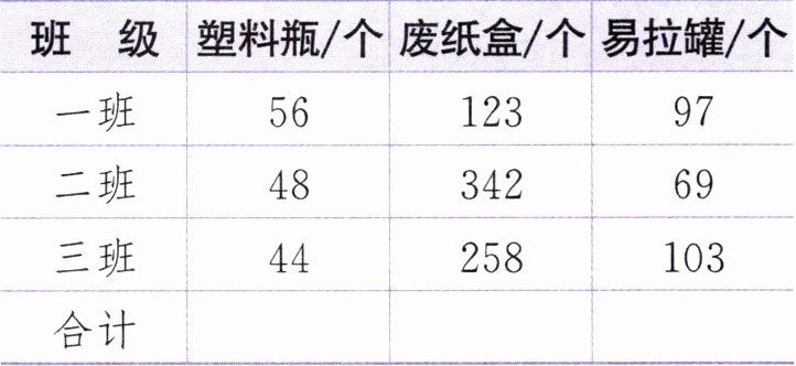 5. 完成下面四年级三个班回收废品情况的统计表。你能用简便方法很快地算出合计数据吗?