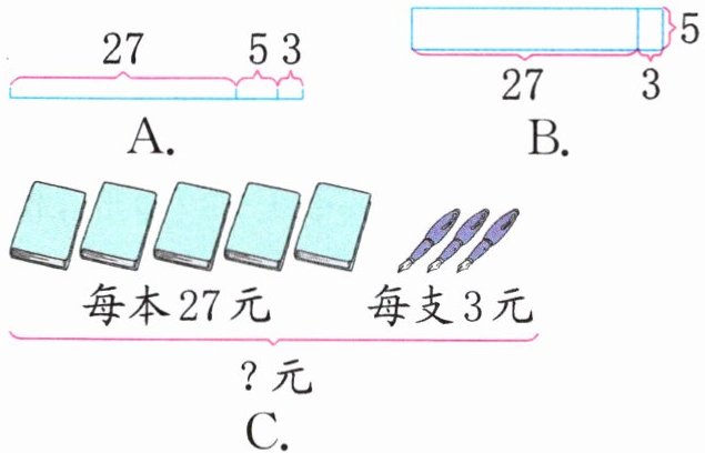 4. (几何直观)下面各图中,可以用来说明$5× 3+5× 27=(3+27)× 5$的是(