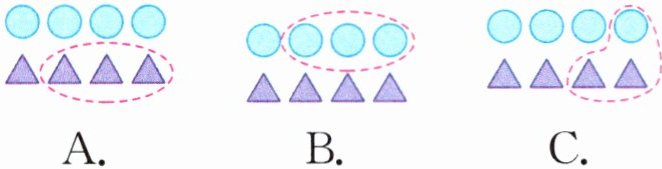 (2)(南通真题)小明在计算$4×(◯+\triangle)$时,看成了$4×◯+\triangle$,结果比原来小了12。下面各图中,圈出的部分表示12的是(