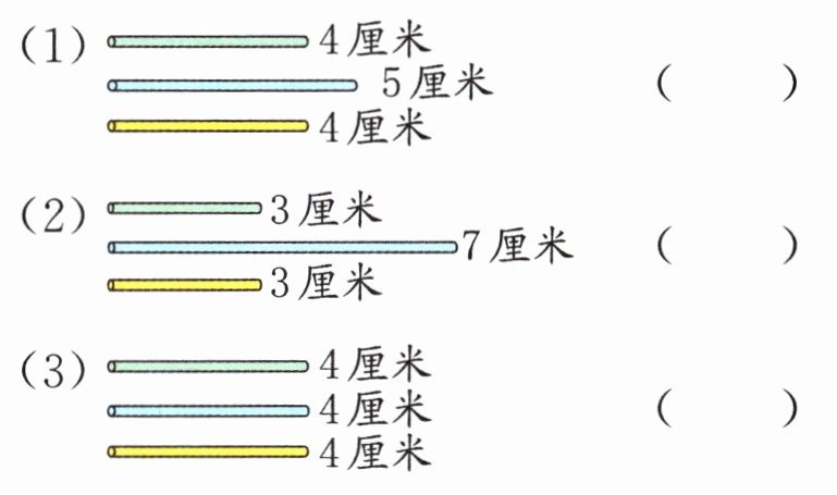 1. 在能围成三角形的一组小棒右边的括号里画“√”,不能的画“×”。