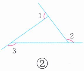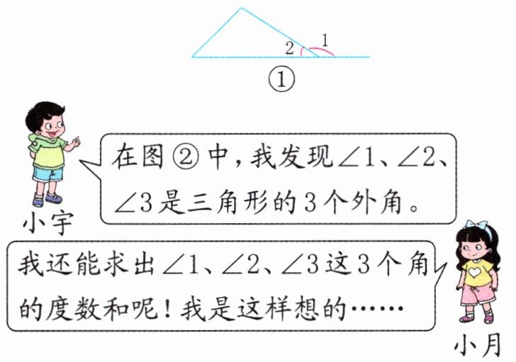 小月的思考过程:用“3个平角的和”减去“三角形的内角和”就可以求出$∠1$、$∠2$、$∠3$的度数和。$180^{\circ}×3 = 540^{\circ}$,$540^{\circ} - 180^{\circ} = 360^{\circ}$。