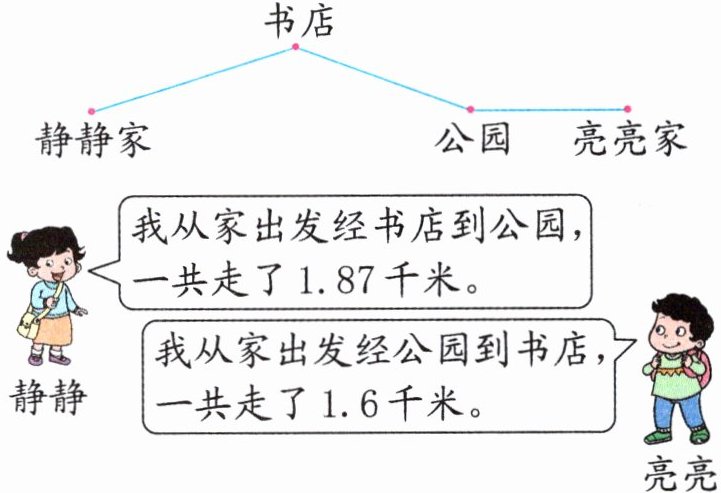 解析:1.87千米和1.6千米中都包含了书店和公园之间相距的0.87千米,因此只要从1.87千米与1.6千米的和中减去0.87千米就是从静静家到亮亮家要走的路程。