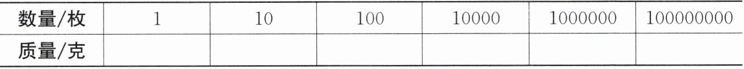4. 一枚 1 元的硬币约重 6 克。照这样计算,1 亿枚 1 元的硬币约重多少克?你能填写下表吗?(3 分)