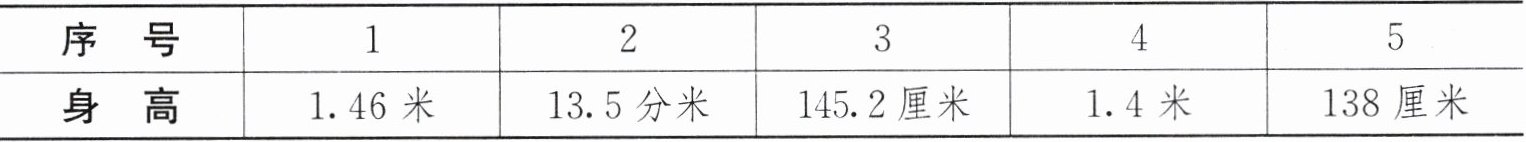 答案:4.13.5分米 = 1.35米 145.2厘米 = 1.452米 138厘米 = 1.38米 1.35<1.38<1.4<1.452<1.46 从前往后依次为2号、5号、4号、3号、1号