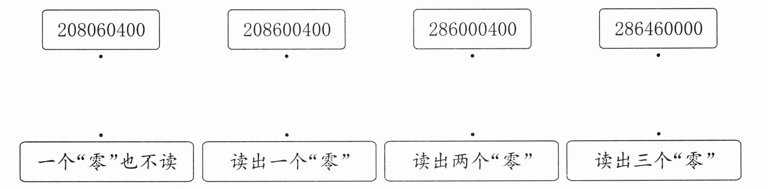 208060400——读出两个“零”;208600400——读出两个“零”;286000400——读出一个“零”;286460000——一个“零”也不读