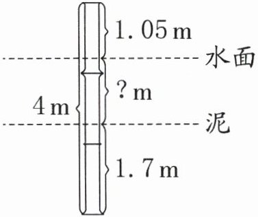 3. 如图,王叔叔把一根 4m 长的竹竿垂直插入自家的鱼塘中,竹竿入泥的部分长 1.7m,露出水面的部分长 1.05m,鱼塘水深多少米?(5 分)