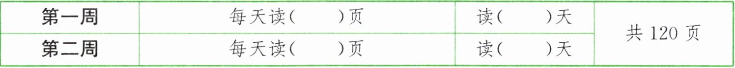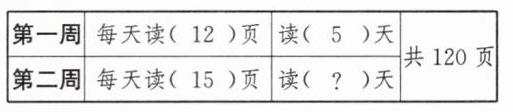 2. 阳光小学开展“数学阅读活动”,小军买了一本《趣味数学》,共120页,第一周读了5天,平均每天读12页。第二周准备每天读15页,还要读几天?(把条件和问题先填入下表进行整理,再解答)