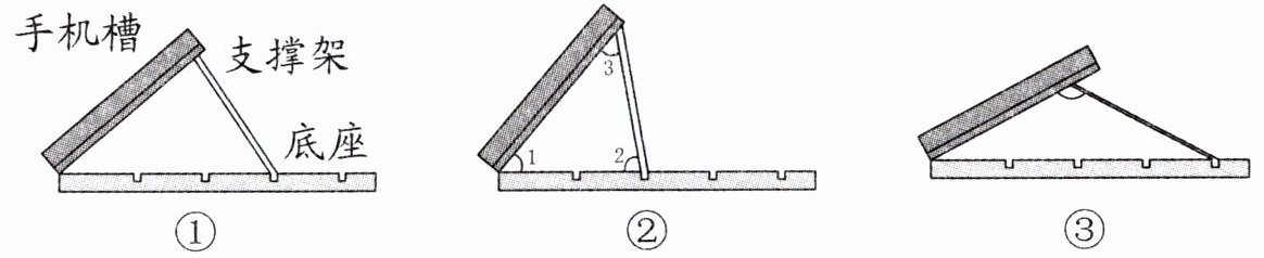 2. (盐城真题)如图,图①是可调节的手机支架示意图,底座、支撑架和手机槽构成了一个三角形。如果将支撑架调节成图②的样子,$\angle 1 = 50^{\circ}$,$\angle 2 = 80^{\circ}$,那么$\angle 3 =$(